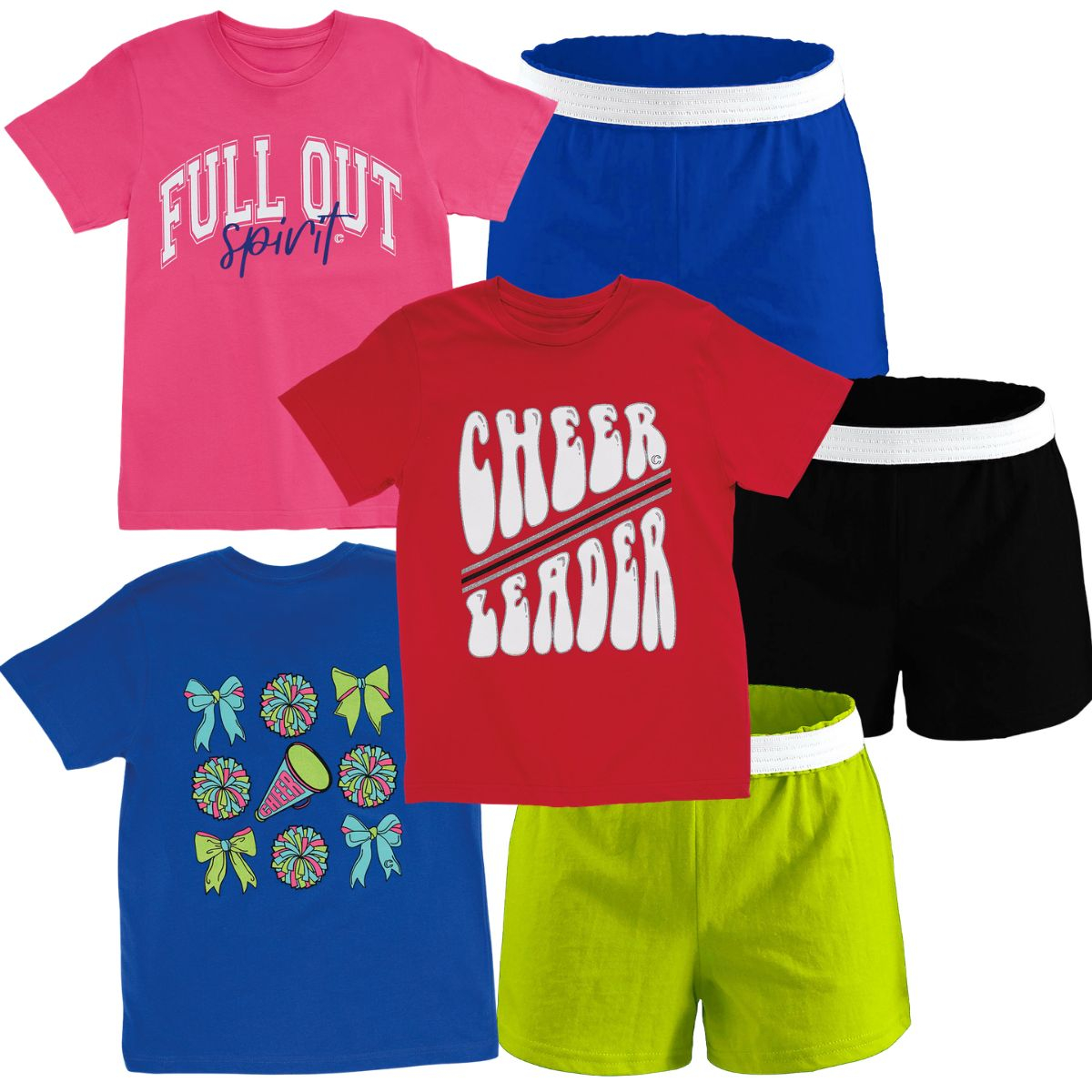 Package includes: Three In-Stock t-shirts, and three knit cheer practice shorts.