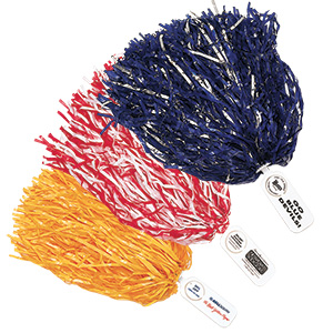 | This rooter pom style is an advertiser's dream! The Coupon Tab handles features a pop-out token made of rigid white plastic ideal for redeeming any special promotional gift. Available with 500 12" plastic streamers in one color, two mixed colors, and three mixed colors. Streamers are available in standard school colors. Imprint a special message or school slogan on the each ring tab handle. Imprint Coupon area measures 1 1/8" diameter and Tab area measures 1 3/8" x 2". Second side and/or second color printing available. Add $60.00 die charge per color and/or side. Add $.10 per pom per additional color and/or side. One color, one sided imprint fee is included in prices shown below. Manufacturing time is approximately 2-3 weeks. Call 800-411-4105 for pricing. Minimum order quantity is 100. |