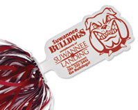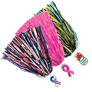 | The Mascot handles feature a large flat mascot shaped tab made of rigid white plastic ideal for advertising any special promotional message. Available with 500 12" plastic streamers in one color, two mixed colors, and three mixed colors. Streamers are available in standard school colors. Imprint a special message or school slogan on the each mascot handle. Second side and/or second color printing are available. Add $60.00 die charge per color and/or side. Add $.10 per pom per additional color and/or side. One color, one sided imprint fee is included in prices shown below. Manufacturing time is approximately 2-3 weeks. Call 800-411-4105 for pricing. Minimum order quantity is 100. ![]() |