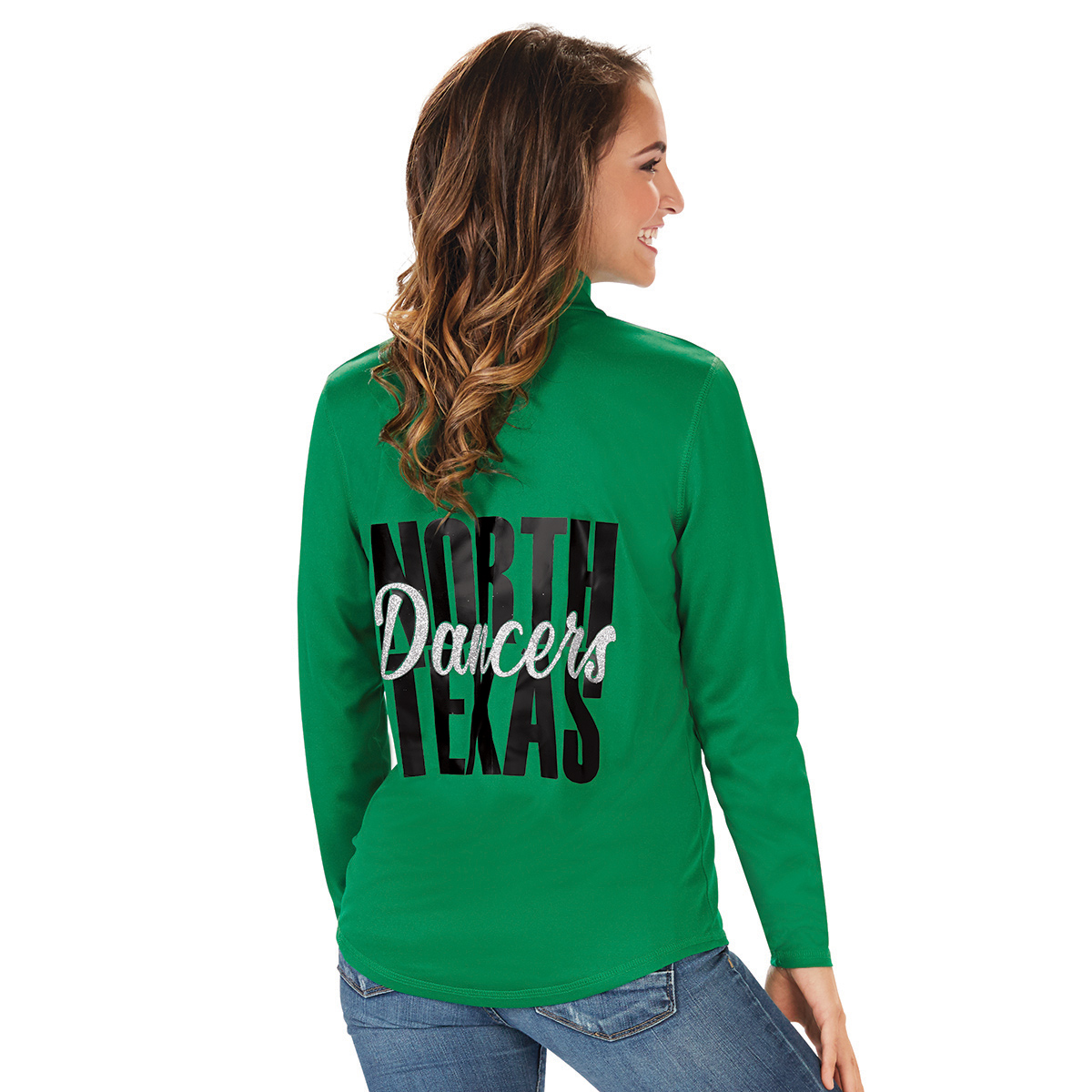 Model is wearing the Ladies Attain Pullover in Kelly Green with Vinyl Decoration on the back (priced separately.) Call 1-800-411-4105 or email sales@cheerleading.com to order this garment with decoration.