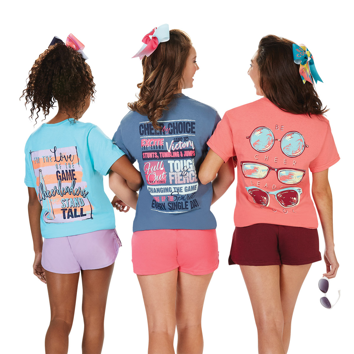 Tough & Fierce, Fun & Fashionable, this cute tee design represents a cheerleader perfectly! The front upper left chest features a bright CHEER circle design, while the full back design features bold text that describes that exciting cheerleader lifestyle.