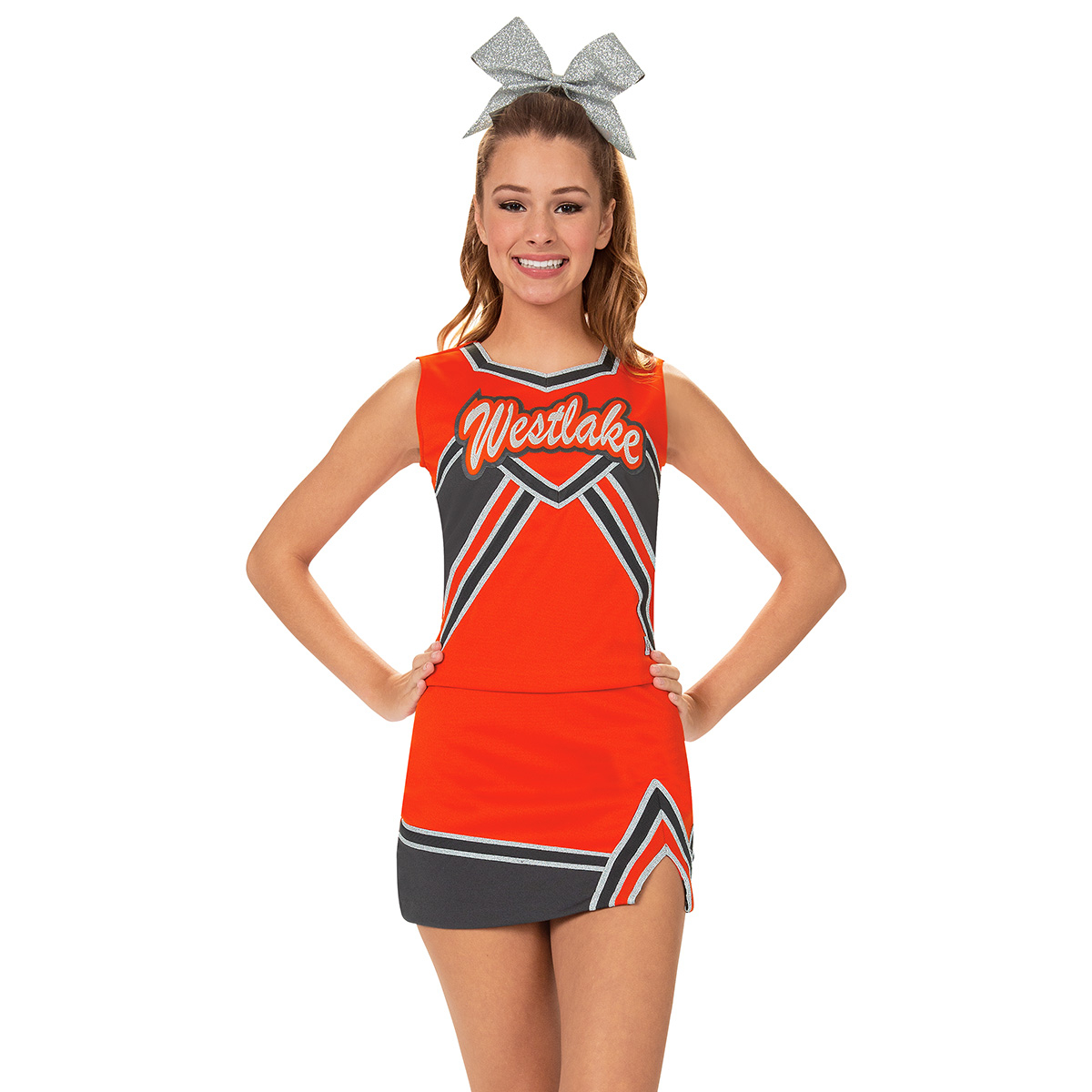 Sweetheart neck shell with solid V-neck back and elastic waist A-line skirt.