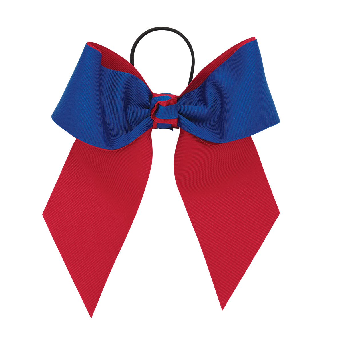 The Custom Large Two-color Bow includes 2- 2 1/4" solid color ribbons. It is secured to an elastic ponytail holder. Approximate bow width is 6".