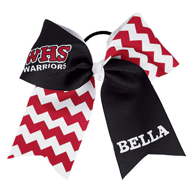 Customize our Chevron Team Sublimated Bow to match your team colors. You can also personalize these bows with Team Member Names. This sublimated grosgrain bow is secured to a comfortable elastic ponytail holder. Ribbon Width: 3". Approximate Bow Size 7"x7 1/2".
