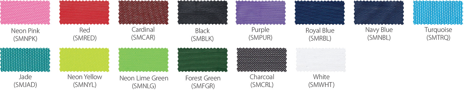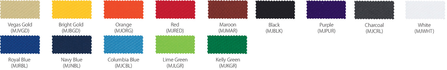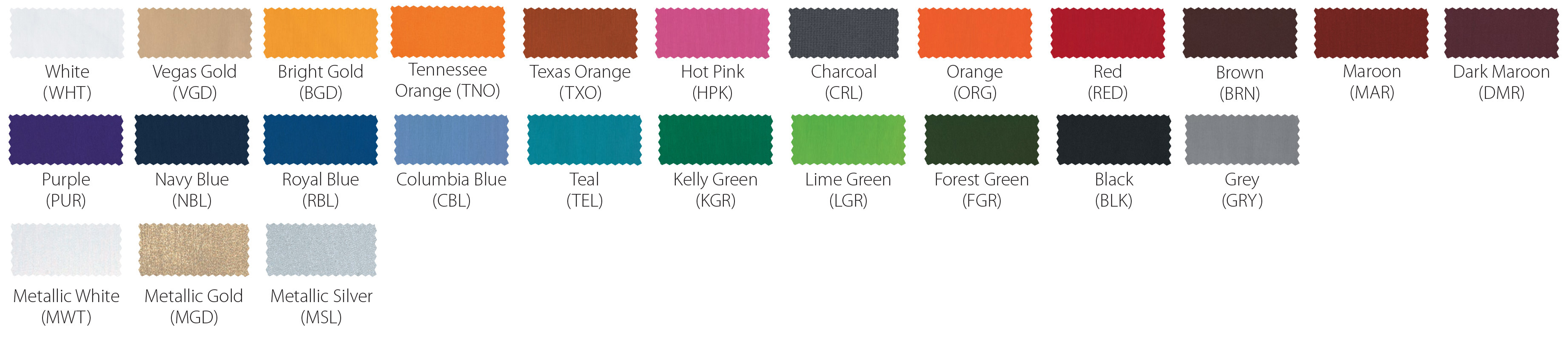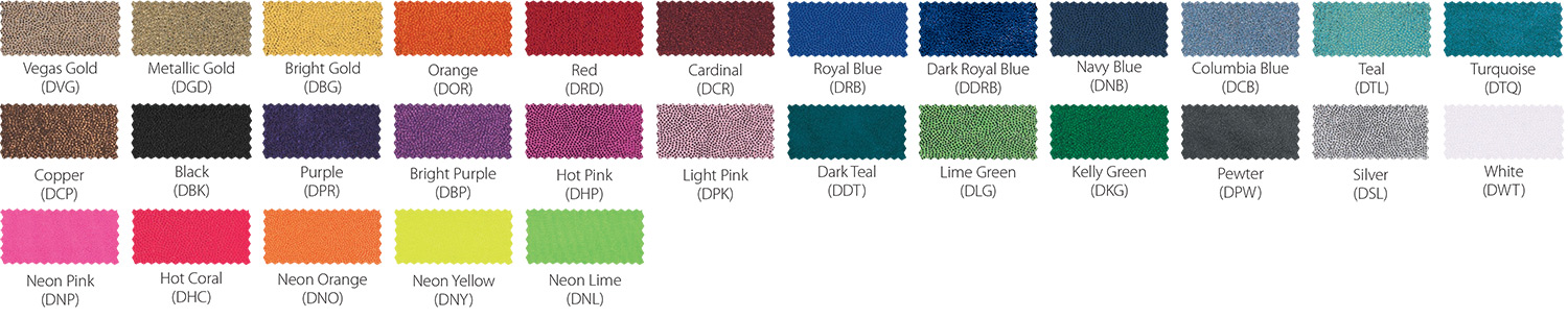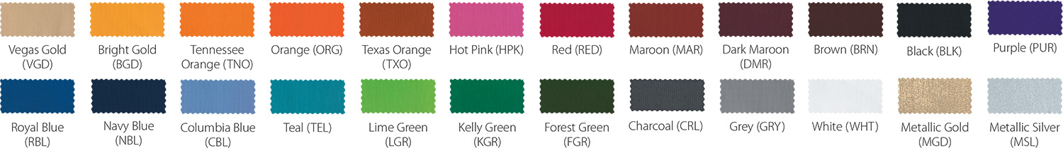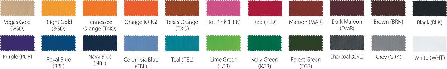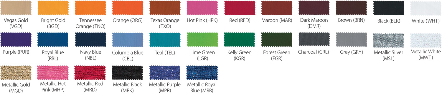 *Due to printing limitations, colors displayed here may not be a true color match. Due to fabric limitations and differences in materials, colors between different types of materials may not be an exact match. We will be happy to provide fabric color swatches of our material for your use. Call us today at 214.343.3333 or submit our contact us form to discuss your team color options with a sales representative!
