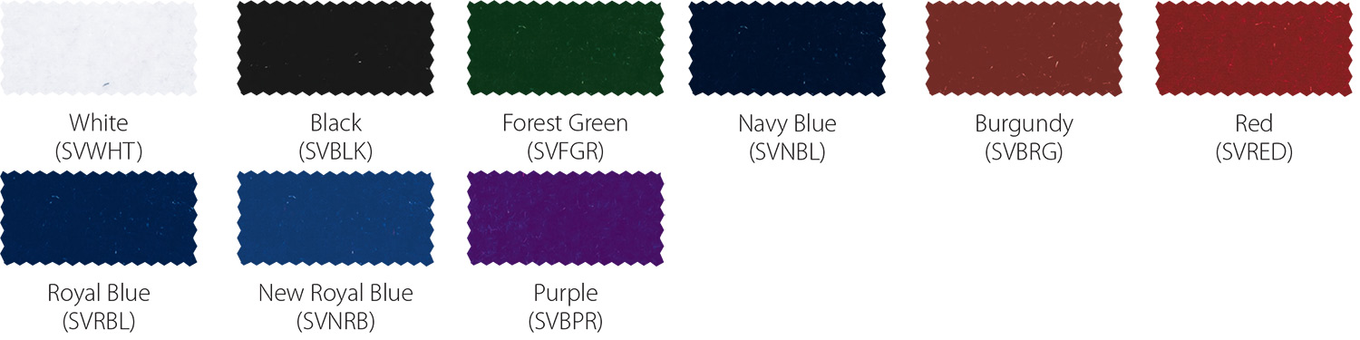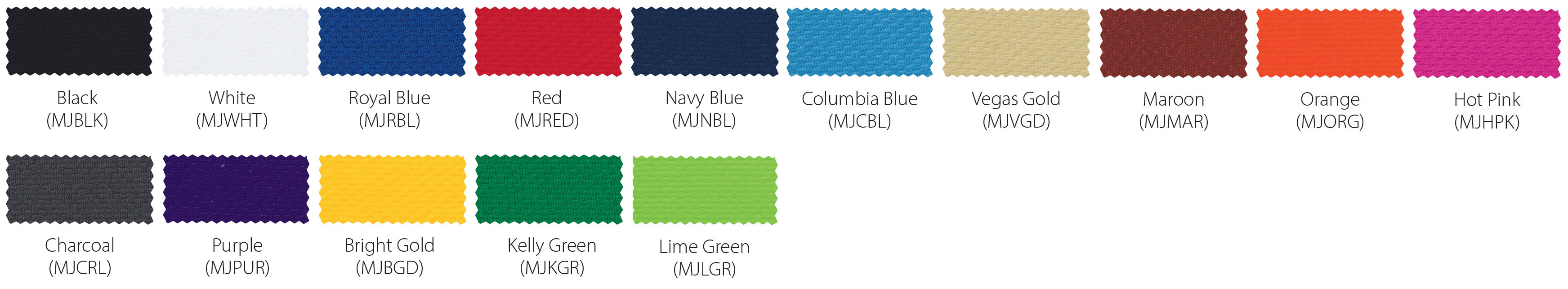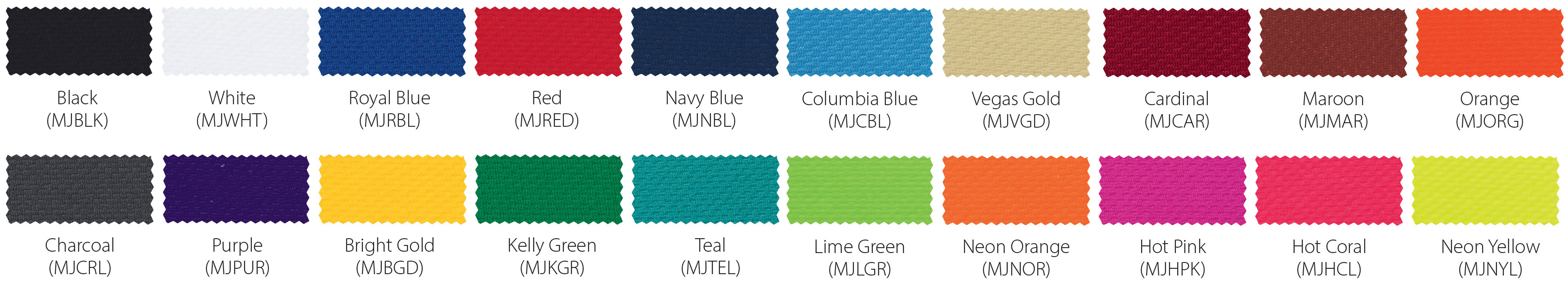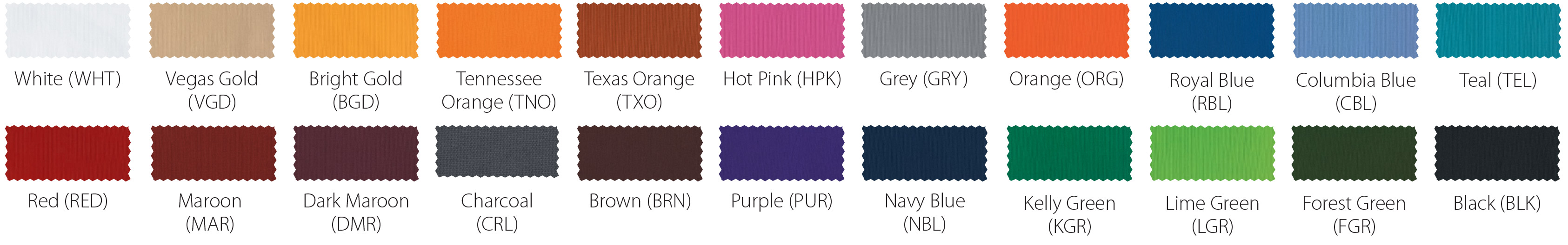 *Due to printing limitations, colors displayed here may not be a true color match. Due to fabric limitations and differences in materials, colors between different types of materials may not be an exact match. We will be happy to provide fabric color swatches of our material for your use. Call us today at 214.343.3333 or submit our contact us form to discuss your team color options with a sales representative!
