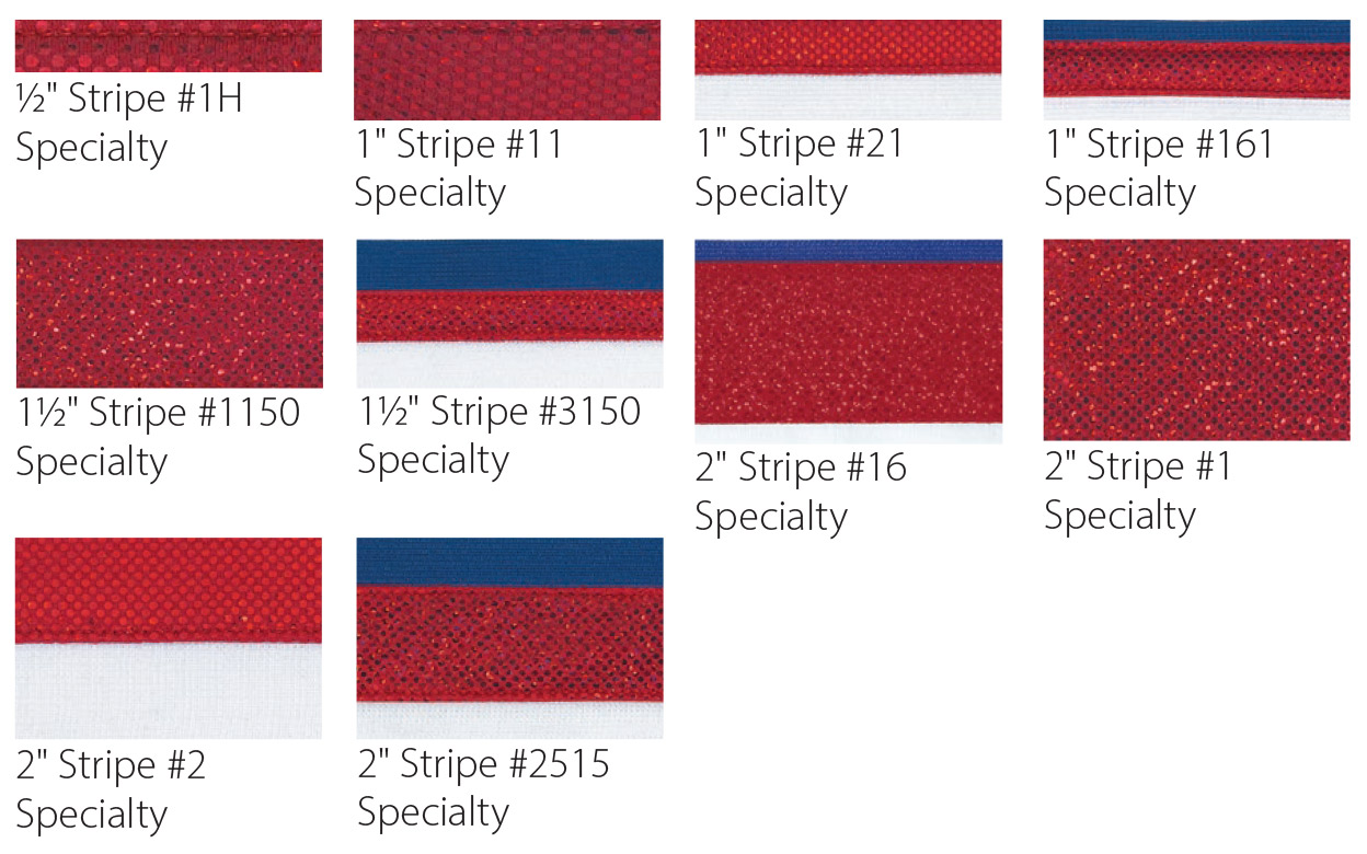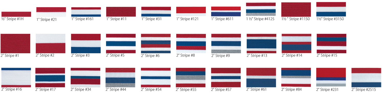 Poly/Spandex knit striping is offered in all available polyester and Flexstretch™ colors. Striping may be upgraded to metallic colors for an additional $5.00 per garment. See Striping section below for available metallic striping colors.
