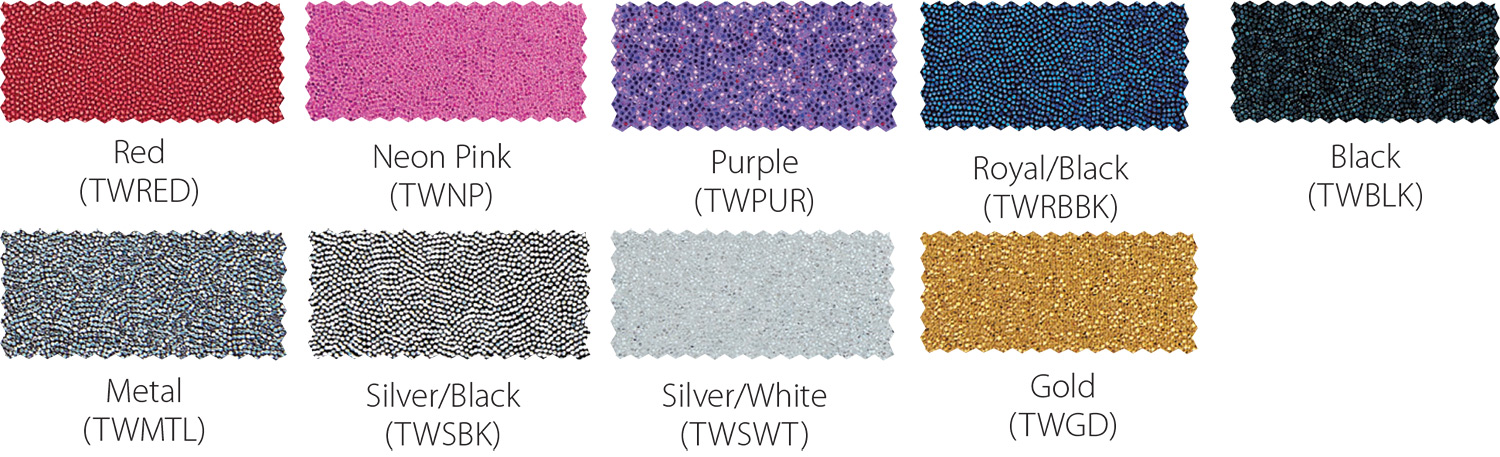 Standard emblems are made from satin-like woven 100% polyester Tackle Twill, and are sewn directly onto your garment. Tackle twill lettering may be upgraded to metallic colors for an additional $5.00 per emblem. See Metallic Tackle Twill section below for available metallic tackle twill colors. Any of our lettering styles may be upgraded to stretchy Specialty or SpiritFlex™ material for an additional $20.00 per emblem. See Specialty Fabric and SpiritFlex™ sections for available colors. Monogram lettering is embroidered directly onto your garment and is available in any polyester uniform color. Monogramming may be upgraded to Metallic Gold (MGD) or Metallic Silver (MSL) for an additional $5.00 per monogram. Monogramming adds approximately 2 weeks manufacturing time.