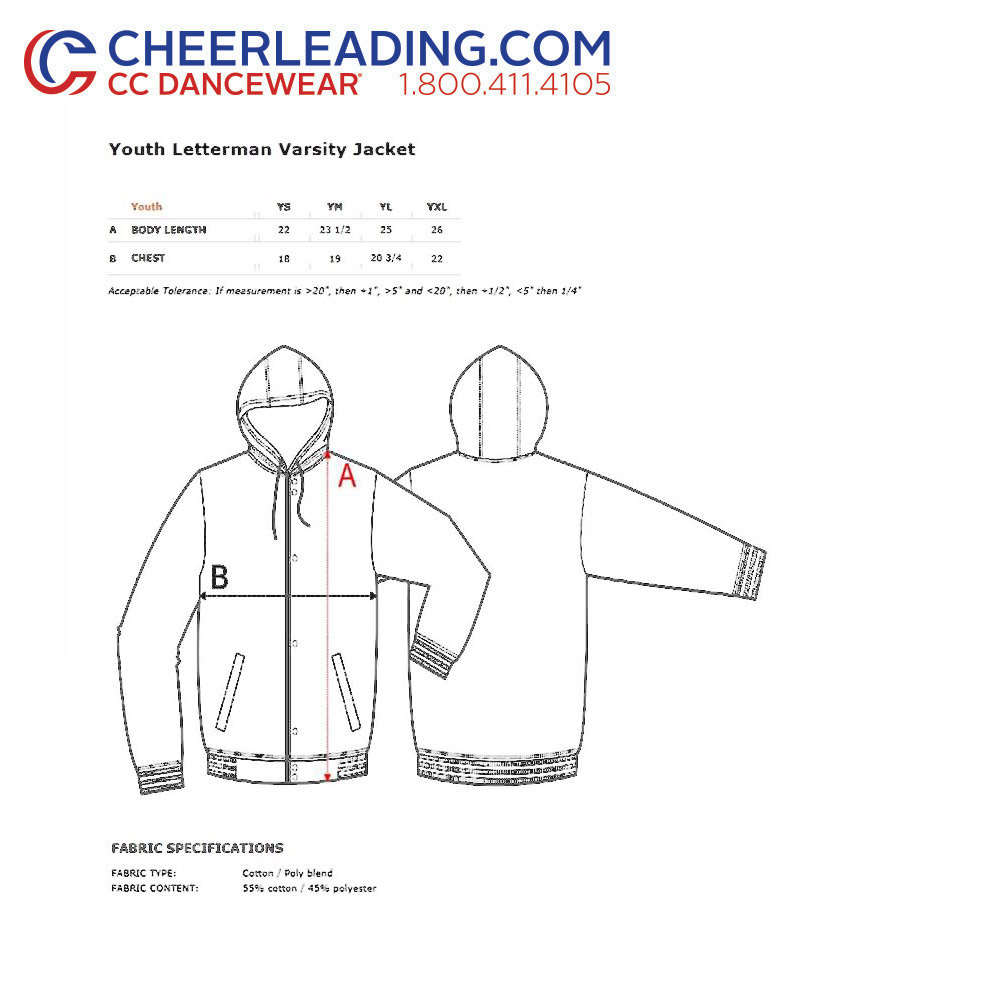 ALL NEW!! Show your spirit around town in our Letterman Varsity Jacket! These soft jackets will add a touch of sophisication to your game day look, and keep your team warm on the sidelines! Add tackle twill or monogramming to customize your teams jackets. Shown with Tackle Twill style TSLLCPR2. View all of our Monogramming styles here. Monogramming and Tackle Twill Lettering sold separately. Email sales@cheerleading.com or call us at 1-800-411-4105 to order custom garments.