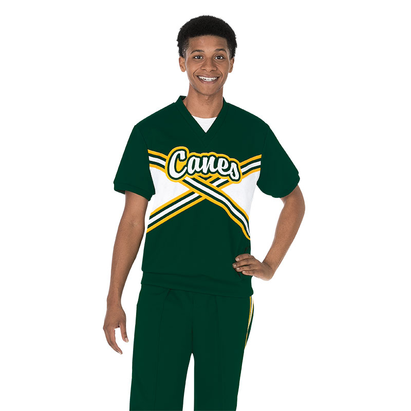 Men's poly V-neck top with rib waistband 9851P5; poly elastic waist pants with crease-stitch front 9200S5. Price includes top and pants; lettering priced seperately. Made-to-order items are not returnable or exchangeable.Lettering shown: TARBR3
