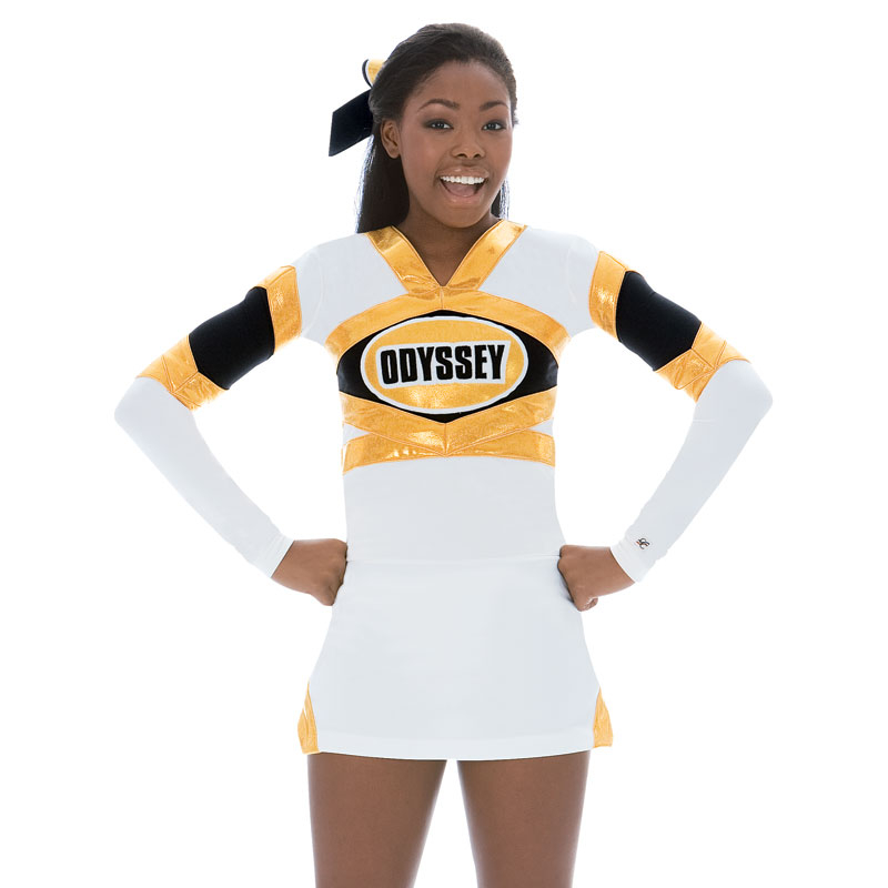 V-neck SpiritFlex long sleeve top SP2469B1150; poly elastic waist mid-rise skirt 65459EH1150. Price includes top and skirt; lettering sold seperately. Additional $20 per package for specialty striping, as shown. Made-to-order items are not returnable or exchangeable.