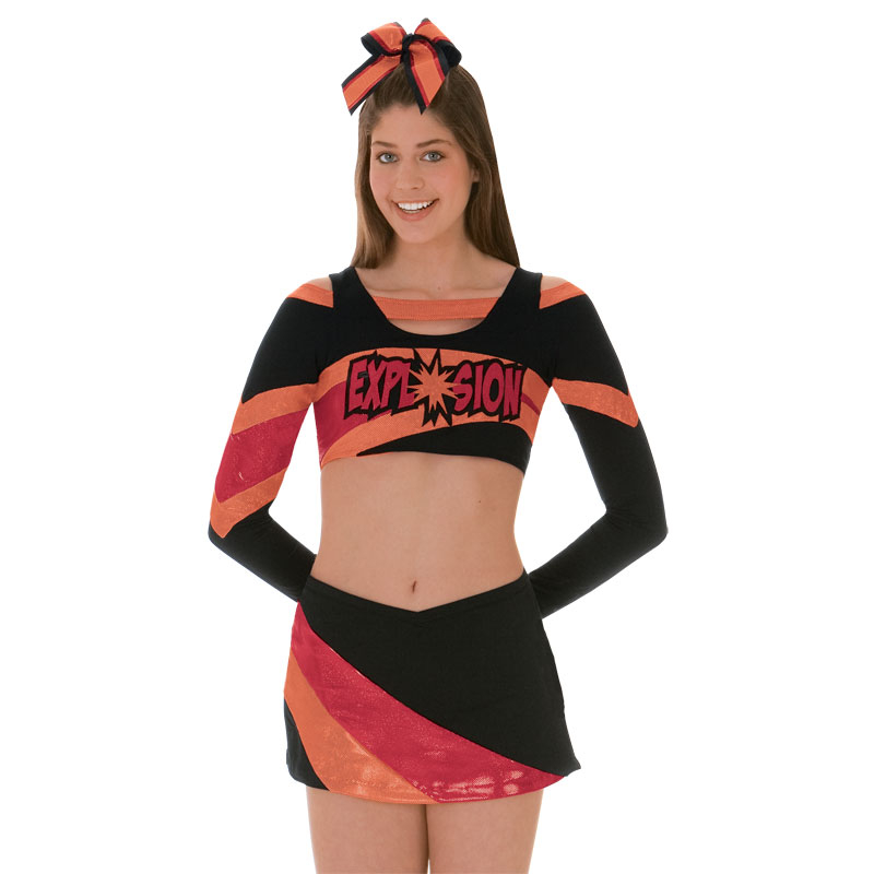 Boat neck strappy SpiritFlex long sleeve top SP25750K; SpiritFlex zipper V-waist mid-rise skirt SP6572V. Price includes top and skirt; lettering sold seperately. Made-to-order items are not returnable or exchangeable.