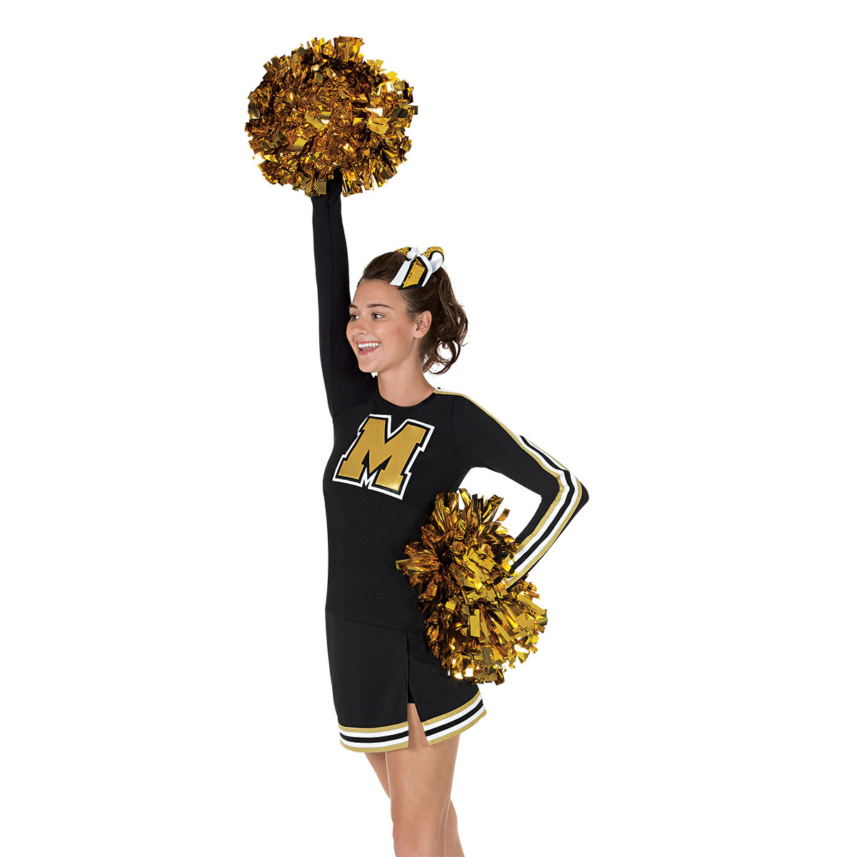 Jewel neck SpiritFlex long sleeve top SP24199S5; poly elastic waist skirt 1423ECH5. Price includes top and skirt; lettering sold seperately. Additional $10 per package for metallic striping, as shown. Made-to-order items are not returnable or exchangeable.