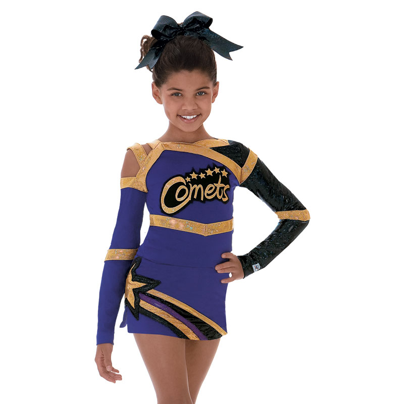 Sweetheart neck strappy SpiritFlex long sleeve top SP2455B11; poly elastic waist mid-rise skirt 6546EH1H. Price includes top and skirt; lettering sold seperately. Additional $25 per package for specialty striping on top and skirt and specialty fabric on skirt, as shown. Made-to-order items are not returnable or exchangeable.