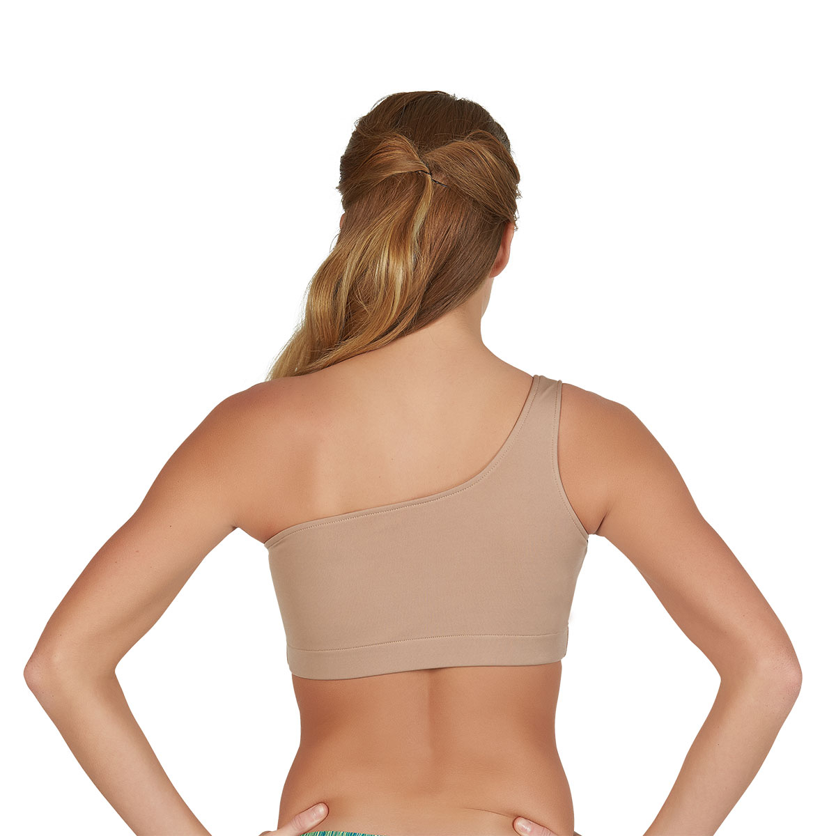 Made-to-order one-shoulder sports bra, available in most specialty fabrics. The reversible design makes this bra top versatile and ideal for any off the shoulder outfit. Made in USA. Minimum order 6. Prior to ordering, please view our current estimated manufacturing times. Made-to-order items are not returnable or exchangeable.