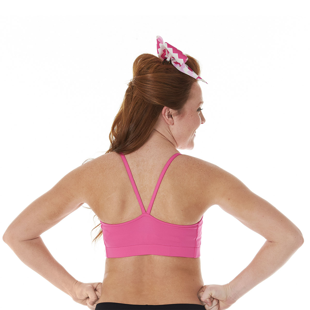 Made-to-order sports bra, available in most specialty fabrics. Made in USA. Minimum order 6. Prior to ordering, please view our current estimated manufacturing times. Made-to-order items are not returnable or exchangeable.