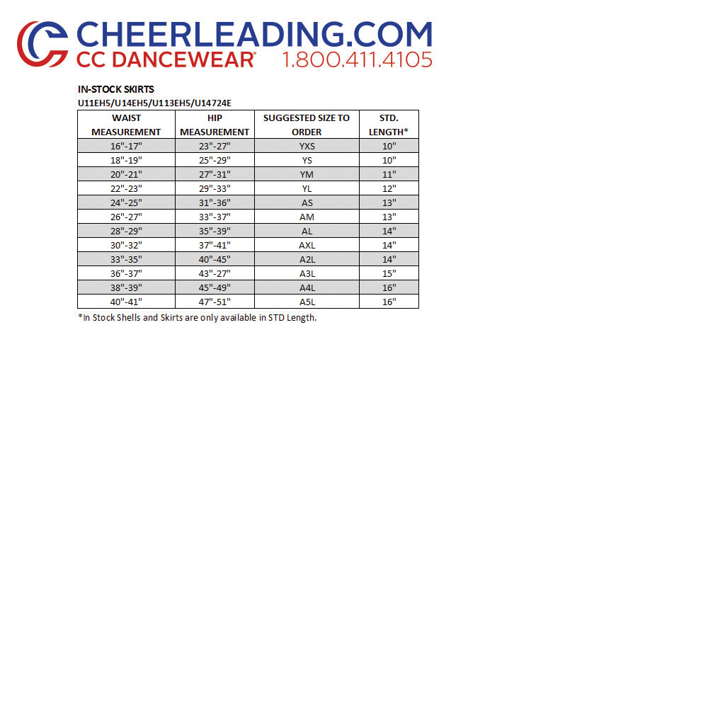 Our pleated cheer uniform skirt offers a classic look for your squad. They are a great way to show your team spirit. Great to use as a tailgate skirt or just to show your team spirit at a game or pep rally. Each In-Stock Uniform is made in the USA of the same high-quality moisture wicking 100% polyester fabric as our custom-made uniforms. Pieces are priced separately to allow you to mix and match, making your In-Stock Uniform unique to you!