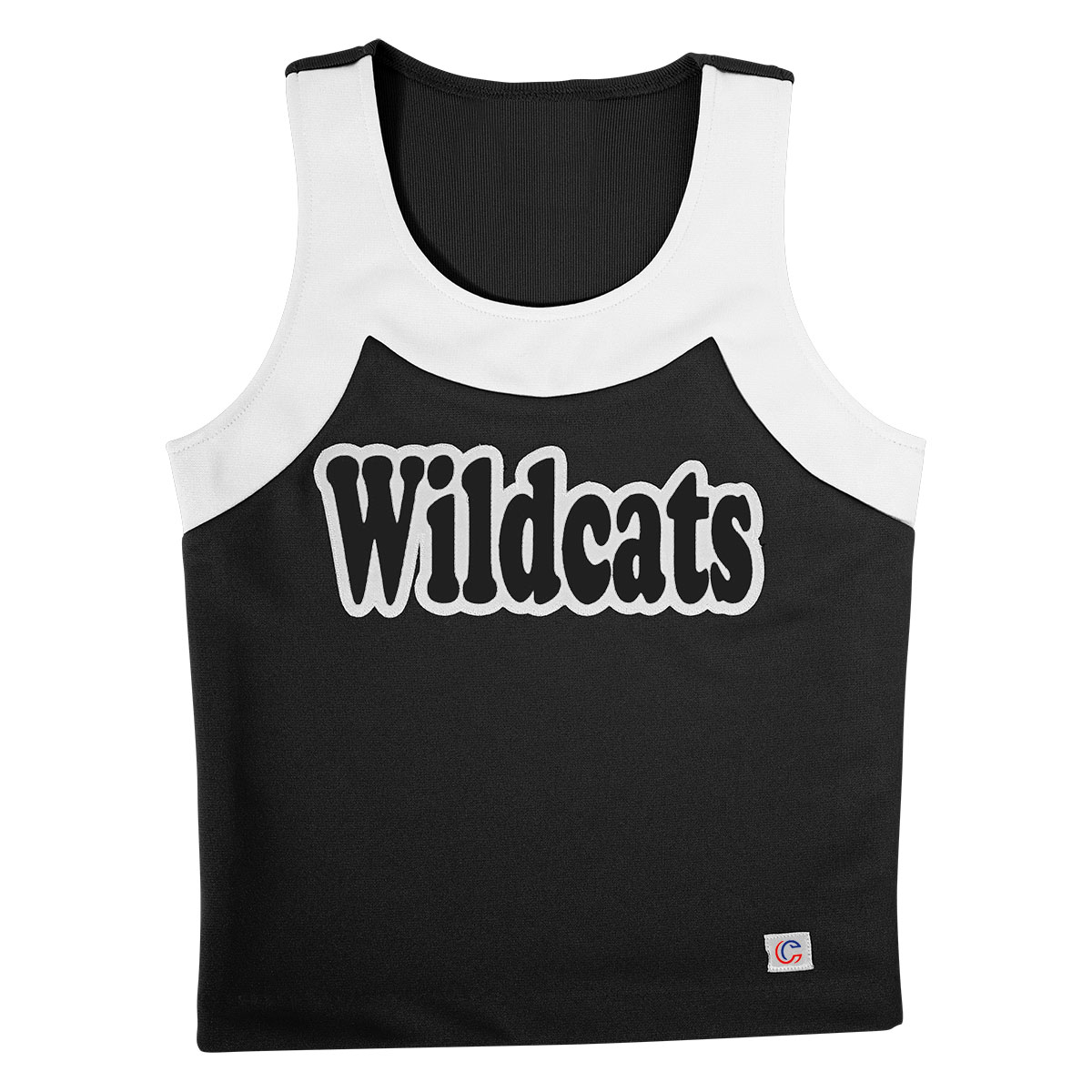 Modern, clean cheer uniform top design with a round neck and solid Flexstretch racer back.