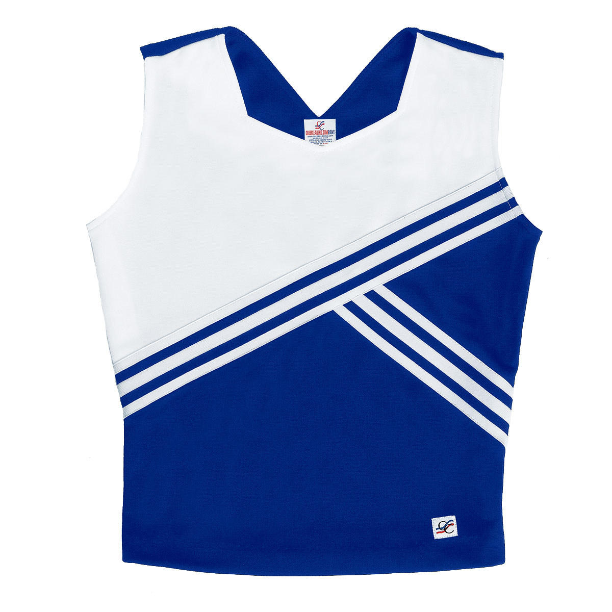 Diagonal design adds a twist to the classic cheer shell top! Sweetheart neck cheer uniform shell with diagonal stripe design. Solid Flexstretch Back.
